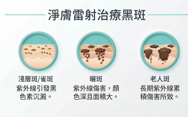 淨膚雷射能夠針對皮膚中的色素顆粒進行破壞,包括雀斑、黃褐斑和老年斑等。雷射光束利用選擇性光熱分解作用,使色素沉澱細胞吸收特定波長的光能後被加熱破壞。隨著皮膚新陳代謝,這些色素細胞會逐漸被身體自然排出。